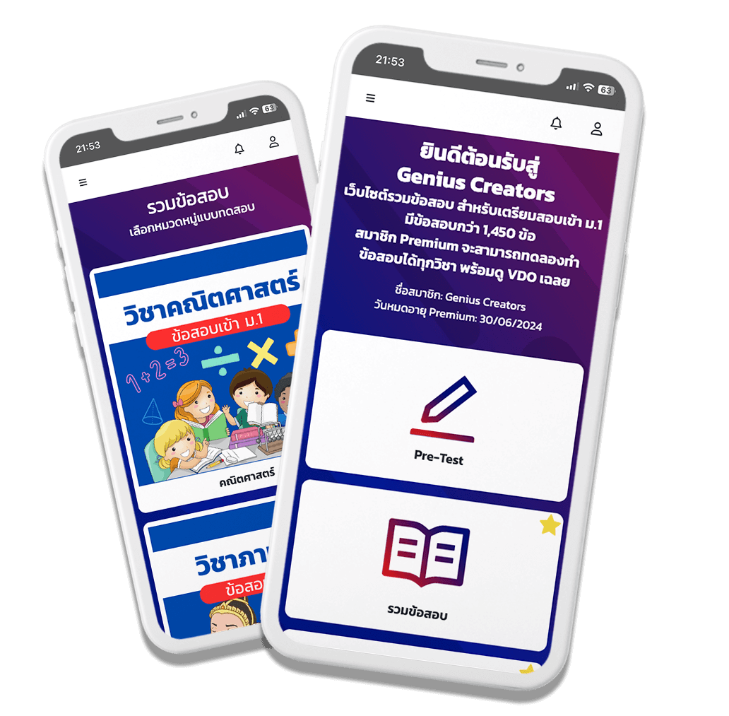 Genius Creators แพลตฟอร์ม ที่รวบรวมข้อสอบ สำหรับเตรียมสอบเข้า ม.1 มากกว่า 1,450 ข้อ มีข้อสอบวิชา คณิตศาสตร์ วิทยาศาสตร์ สังคมศึกษา ภาษาไทย ภาษาอังกฤษ แนวข้อสอบเข้า ม.1 แต่ละวิชาจะแบ่งเป็นชุดย่อย